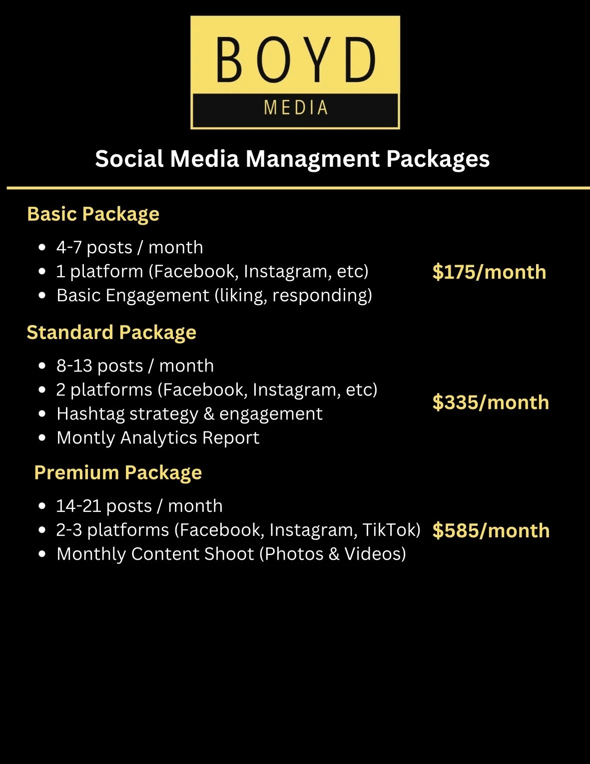 At Boyd Media, we specialize in helping businesses like yours stand out online with our tailored social media management packages,. Let us handle the strategy, content creation, and scheduling so you can focus on running your business while we maximize your reach and engagement. By leveraging our expertise, you’ll gain consistent, professional, and results-driven marketing that builds brand-awareness, strengthens customer relationships., and drives growth, Whether you’re looking to boost visibility, connect with new audiences, or create a lasting online presence, Boyd Media is here to make social media work for you.