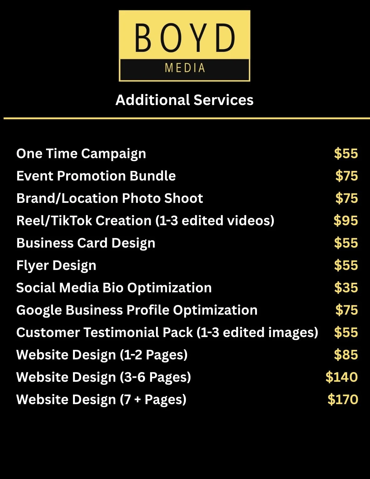 Beyond social media management, Boyd Media offers a full suite of marketing solutions designed to help your business grow from every angle. Our additional services include website design, SEO optimization, content creation, branding, and targeted advertising campaigns,. One of the most powerful tools we emphasize is Google Business Profile Optimization - a crucial step for improving local visibility, attracting new customers, and standing out in search results. Each service is built to complement your online appearance and deliver measurable results. Whether you need a fresh website, stronger search visibility, or compelling content that tells your story, our team provides the tools and expertise to take your business to the next level.